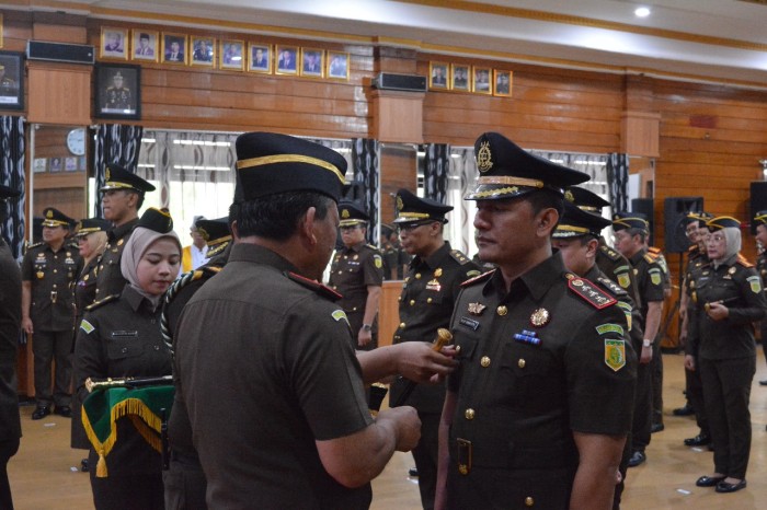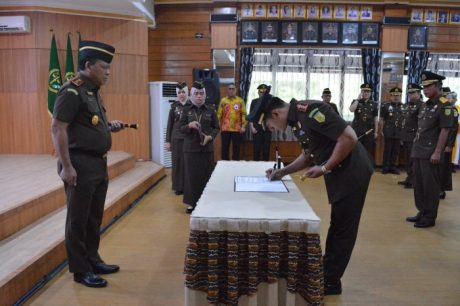 Sertijab berlangsung di ruangan Aula Anjung Papadaan Kantor Kejati dipimpin Kepala Kejaksaan (Kajati) , Dr Muktri SH MH.