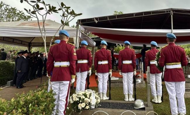 Di mimbar dekat liang lahat, Presiden Prabowo, yang mengenakan setelan jas bewarna hitam lengkap dengan kopiah hitamnya, mengawali prosesi upacara dengan menerima laporan dari komandan upacara, yaitu Kolonel Inf. Benny Angga.