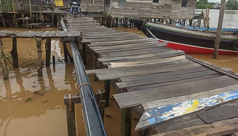 SuarIndonesia — Kondisi titian kayu yang jadi akses utama bagi warga Teluk Ujung Benteng, Kelurahan Mantuil, Kecamatan Banjarmasin Selatan sangat memprihatinkan.