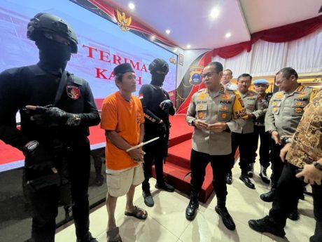 Tersangka Watno turut dihadirkan dalam konfrensi pers yang digelar Kapolda Kalsel, Irjen Pol Andi Rian R Djajadi di Aula Mathilda Batlayeri Mapolda Kalsel, Jumat (27/10/2023) dengan posisi tangan di borgol dan dikawal oleh petugas. (ZI)