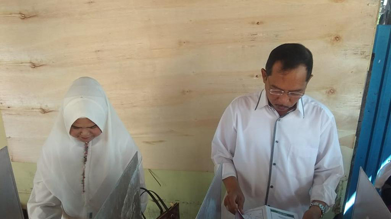 Suarindonesia – Wakil Walikota Banjarmasin H Hermansyah beserta istrinya yang juga Wakil Ketua Tim Penggerak PKK Kota Bajarmasin Hj Siti Fatimah melakukan pencoblosan di TPS 03 Kuin Selatan, Rabu (17/4). Dengan stelan baju putih-putih politisi PDIP Kalsel ini datang ke TPS tepat pukul 10.00 WITA.
