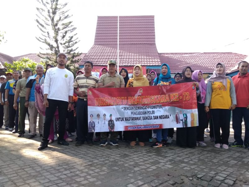 Suarindonesia -Rangkaian menyambut HUT Bhayangkara ke-73, jajaran Polsekta Banjarmasin Barat, melaksanakan senam bersama Aparatur Sipil Negara (ASN) se Kecamatan Banjarmasin Barat, dan para pesonil Koramil1007-03/Banjarmasin Barat, Jum’at (21/6).
